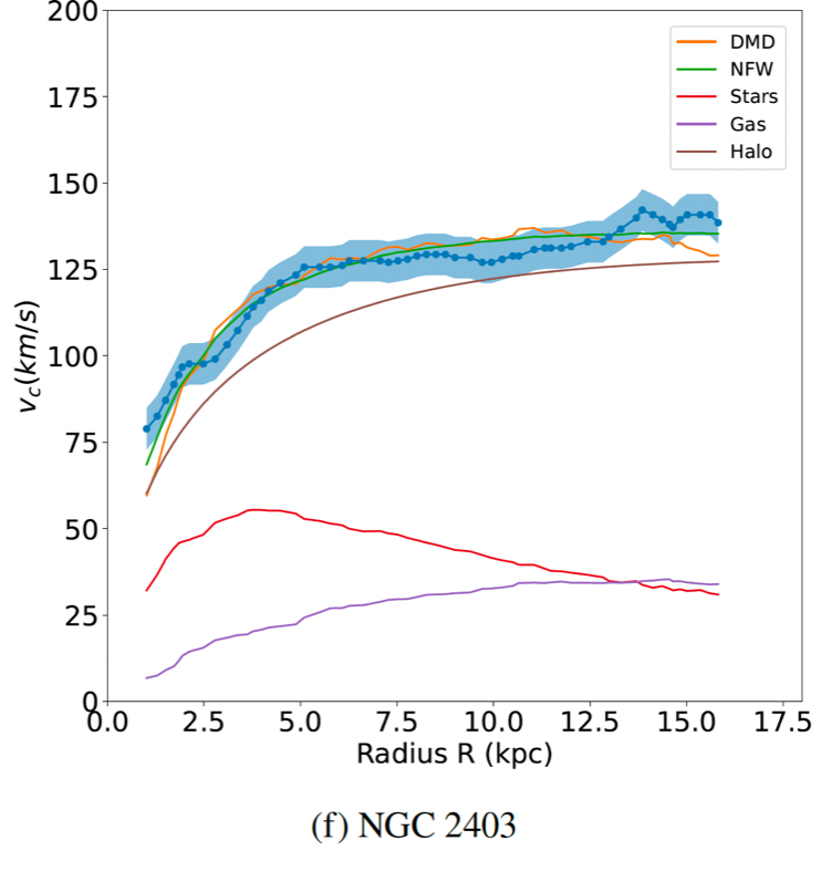 Studiando le curve di rotazione della nostra galassia e delle galassie lontane abbiamo notato una proprietà molto interessante. Mentre l’emissione di radiazione dovuta alle stelle è molto concentrata nella parte centrale, l’emissione di idrogeno molecolare HI, osservabile tramite la riga a 21cm, si estende fino a molto più lontano. Si può così osservare la distribuzione di HI con i radiotelescopi e da questa si può calcolare il contributo dell’HI alla massa e dunque alla curva di rotazione, cioè la velocità in funzione della distanza della materia se ci fosse solo idrogeno molecolare. L’osservazione interessante è che questa curva di rotazione è molto simile a quella osservata, che tiene conto di tutta la massa e non solo di quella dell’idrogeno che rappresenta una piccola frazione di quella luminosa dovuta alle stelle (quest’ultima si può anche misurare dall’osservazione dell’emissione di luce infrarossa). In termini semplici si osserva che moltiplicando per un fattore circa 10 (ma con una grande variabilità da galassia a galassia) la curva di rotazione ottenuta considerando solo HI, si ottiene la curva di rotazione totale. Questo fatto suggerisce che l’idrogeno molecolare sia un “proxy” della distribuzione di massa totale, oltre quella luminosa delle stelle. Ciò significa che dove si osserva un atomo di HI, ce ne dovrebbero essere altri 10 che non emettono la riga a 21cm. Se così fosse si potrebbe spiegare la curva di rotazione di tutte le galassie che fanno parte del migliore campione oggi disponibile per qualità di osservazioni della riga a 21cm, il campione THINGS.