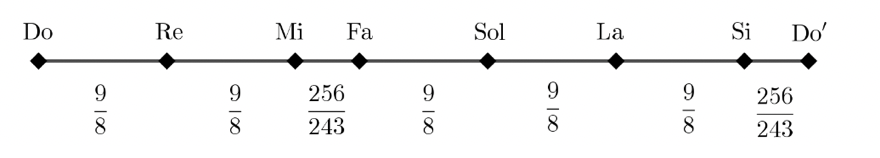 Osserviamo un fatto: quelle che nel parlare vengono descritte come distanze, differenze o somme, sono in realtà rapporti, quozienti e prodotti: ad esempio, un’ottava è formata da una quinta e da una quarta infatti 3/2 x 4/3 = 2. Inoltre la “distanza” fra il Sol e il Fa si ottiene con la divisione 3/2 : 4/3 = 9/8. La frequenza del Sol è i 9/8 di quella del Fa e l’intervallo tra Fa e Sol viene chiamato tono. Naturalmente non si può fare musica con soli tre suoni (e le loro ripetizioni nelle scale superiori) per cui si presentò l’esigenza di aggiungere delle note tra il Do e il Fa e tra il Sol e il Do’ (anche quello è un intervallo di quarta, infatti 2 : 3/2 = 4/3). Aggiungendo una sola nota in ciascun intervallo si ottiene una scala pentafonica, mentre aggiungendone due si ottiene una scala eptafonica. I greci usavano molte scale diverse, ma quella che ebbe vita più lunga era prodotta inserendo due toni dopo il Do e altri due dopo il Sol. I primi due toni (Re e Mi) occupano uno spazio di 9/8 x 9/8 = 81/64 e quindi quello che avanza tra Mi e Fa è 4/3 : 81/64 = 256/243, un intervallo più piccolo che viene chiamato semitono, anche se non è proprio metà di un tono (ovvero la radice quadrata di 9/8). La stessa suddivisione si può fare tra Sol e Do’, inserendo La e Si. È questa la scala pitagorica.