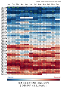 Osservando la tabella che mostra l’estensione mensile rilevata dai satelliti a partire dal 1979, salta all’occhio che i valori dei primi decenni di misurazione erano decisamente maggiori rispetto alle ultime decadi. L’artico si è riscaldato in ogni mese. Interessante, e molto meno discusso sia nei media che in eventi divulgativi, è invece il grafico che mostra l’estensione al termine della estate polare, nel mese di settembre. In questo periodo la banchisa raggiunge il suo valore minimo annuale: nei primi decenni di rilevamento la coperta di ghiaccio si è ridotta molto rapidamente, ma a partire dal 2007 una linea che interpolasse i valori mensili sarebbe quasi orizzontale. Che sia una pausa dalla riduzione drammatica del secolo appena trascorso?