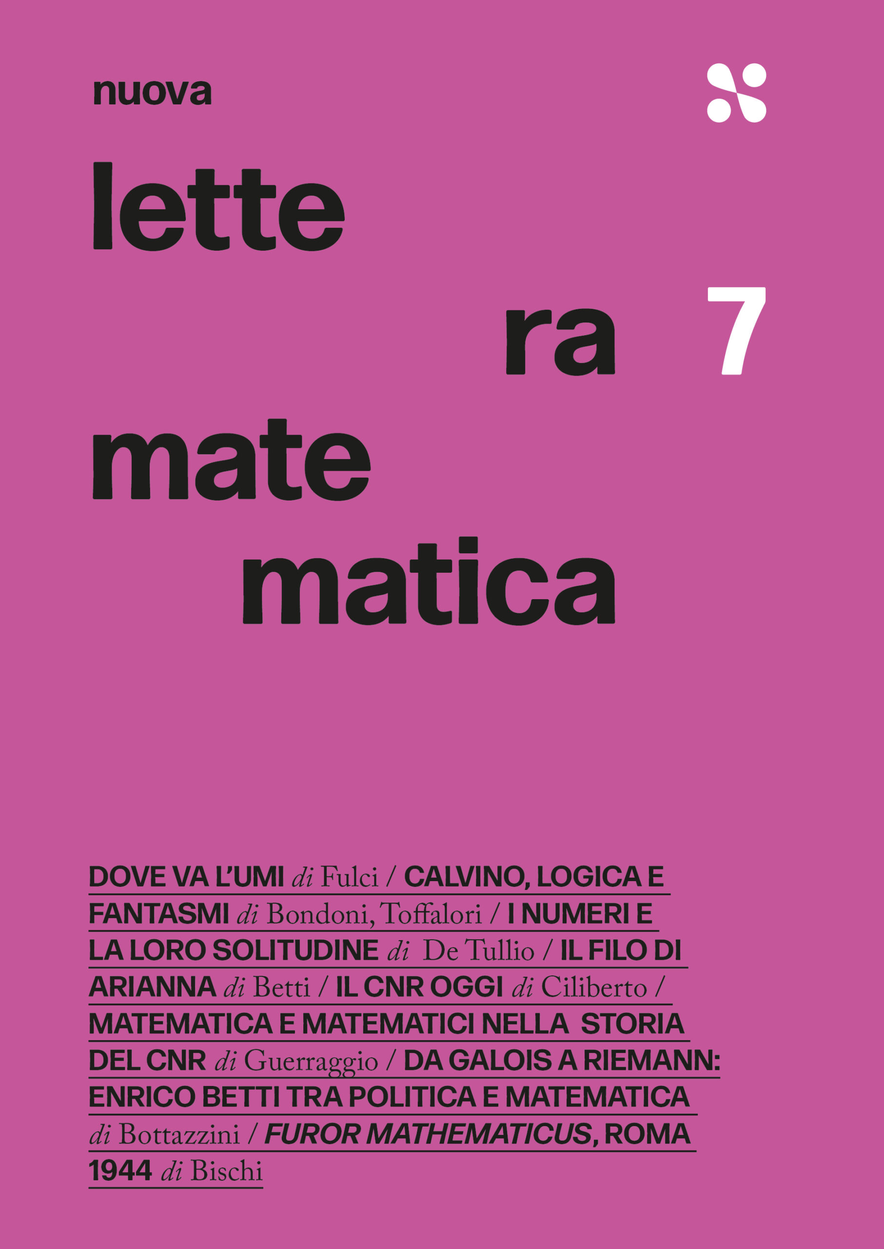 L’intervista a Marco Andreatta e Silvia Benvenuti, da poco eletti a Presidente e Consigliere Scientifico dell’Unione Matematica Italiana (l’associazione che si occupa di promuovere e divulgare lo sviluppo delle Scienze Matematiche, delle loro applicazioni e del loro insegnamento) si affianca a una indagine sul ruolo della matematica all’interno del Consiglio Nazionale delle Ricerche, che fin dalla sua fondazione ha espresso la necessità di una sinergia tra ricerca universitaria e mondo imprenditoriale, volta ad affrontare i problemi più delicati del Paese. Si aggiungono alcuni importanti esempi del ruolo della matematica nella cultura nel suo senso più ampio: dalla letteratura, con Bondoni e Toffalori che esaminano la presenza della logica nell’opera di Italo Calvino, l’articolo di Bischi che ricorda il Furor Mathematicus di Leonardo Sinisgalli, una delle opere più coinvolgenti del Novecento, nell’ottantesimo anniversario dalla sua prima edizione del 1944, fino ai legami con la storia descritti da Umberto Bottazzini che percorre l’Ottocento attraverso la figura del matematico Enrico Betti. Ma ci sono anche due perle matematiche, una sui labirinti (Renato Betti) e una su articolari categorie di numeri primi (Jacopo De Tullio). Completano il volume le usuali brevi ma intense rubriche, dai giochi proposti dai Rudi Mathematici fino agli incontri con la geometria e gli utilizzi della calcolatrice in classe e una rivoluzionaria app matematica per gli studenti.